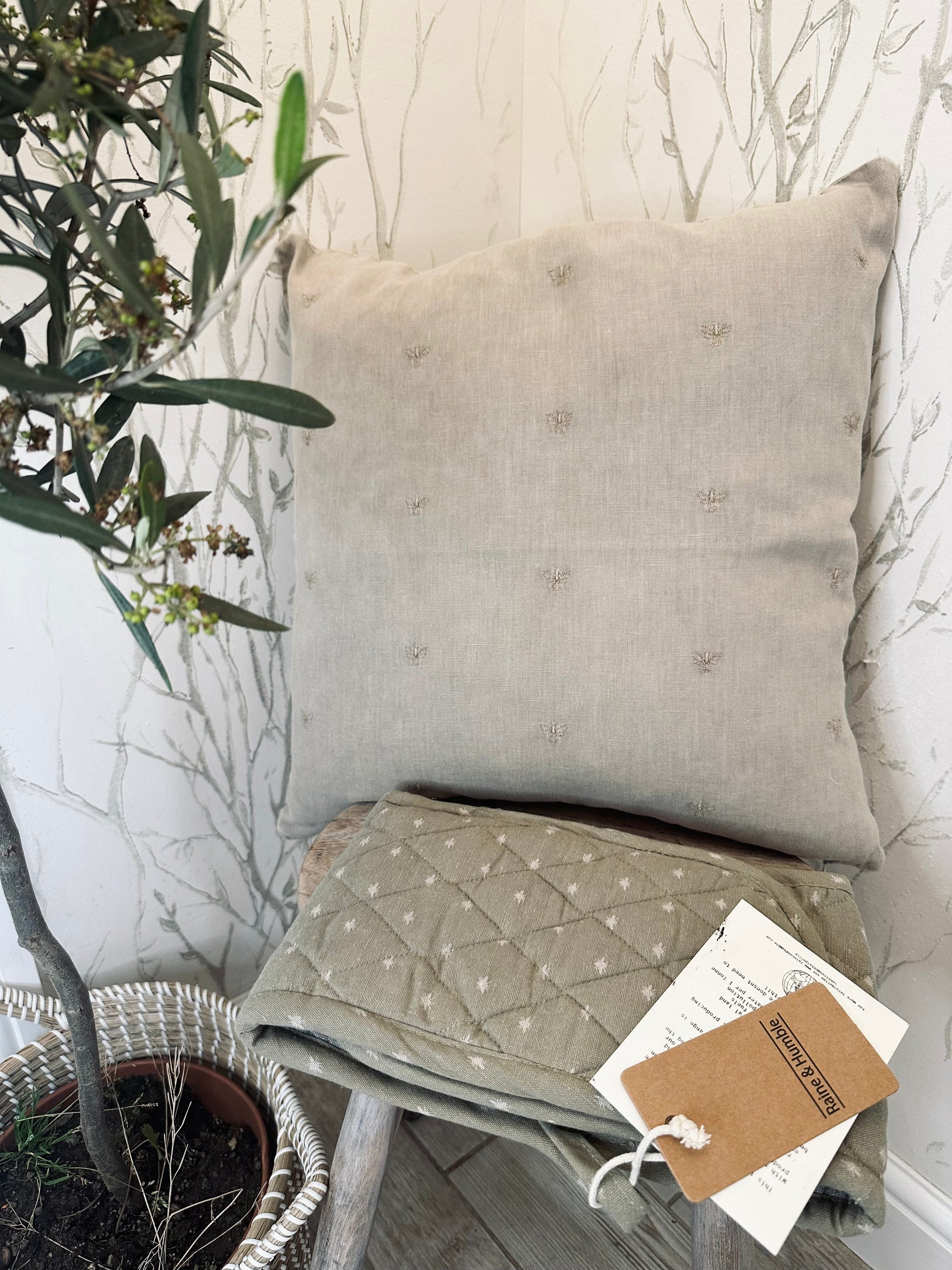 A double oven glove screen printed with a small hand drawn bee design in sage green with a sage green and white woven stripe design on the inside.