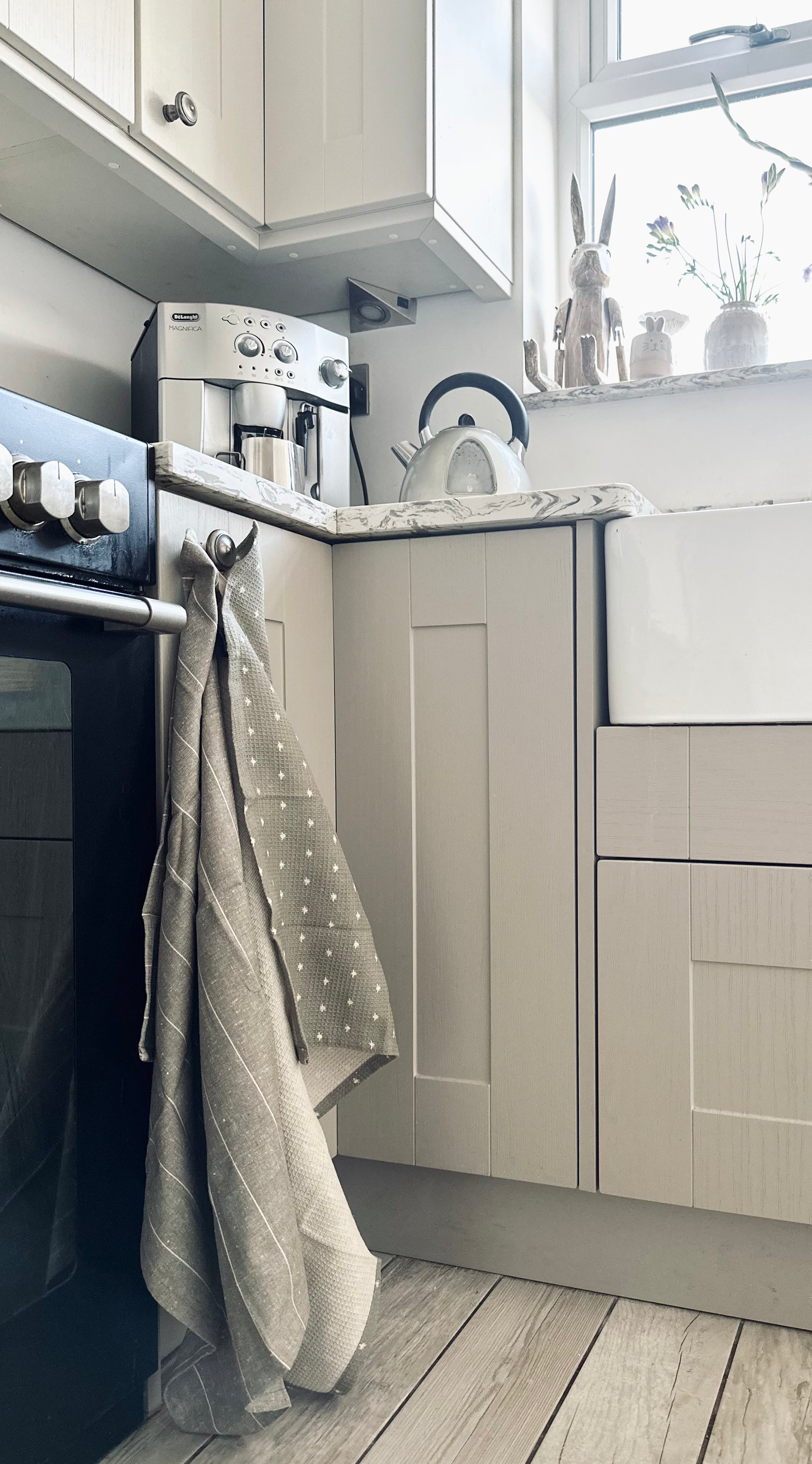 One is screen printed in sage green with a small hand drawn bee design, the other is plain sage green waffle.
