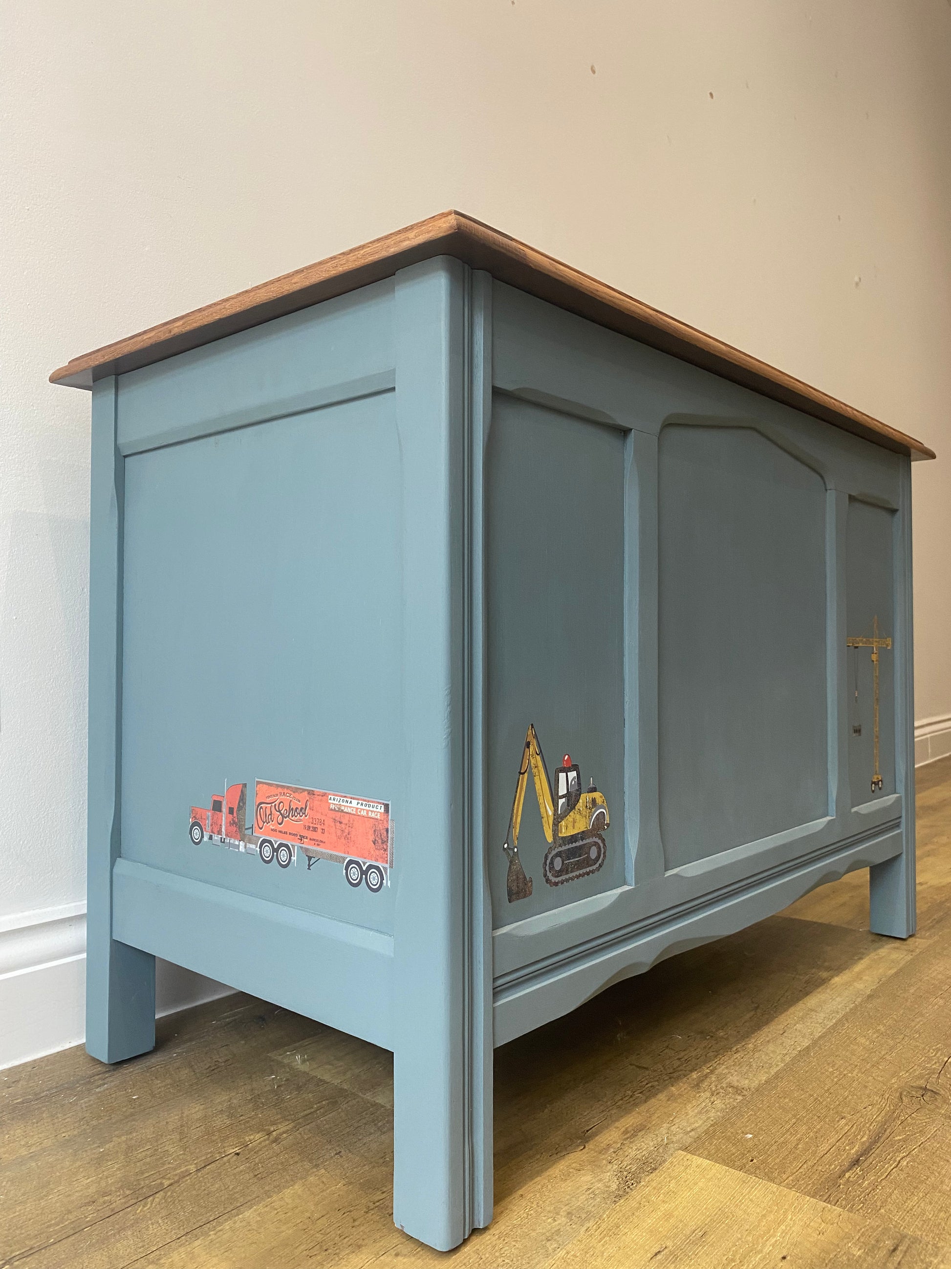 Painted in a delicate shade of blue with construction, bus and fire engine designs applied. What little boy doesn’t love all of these.