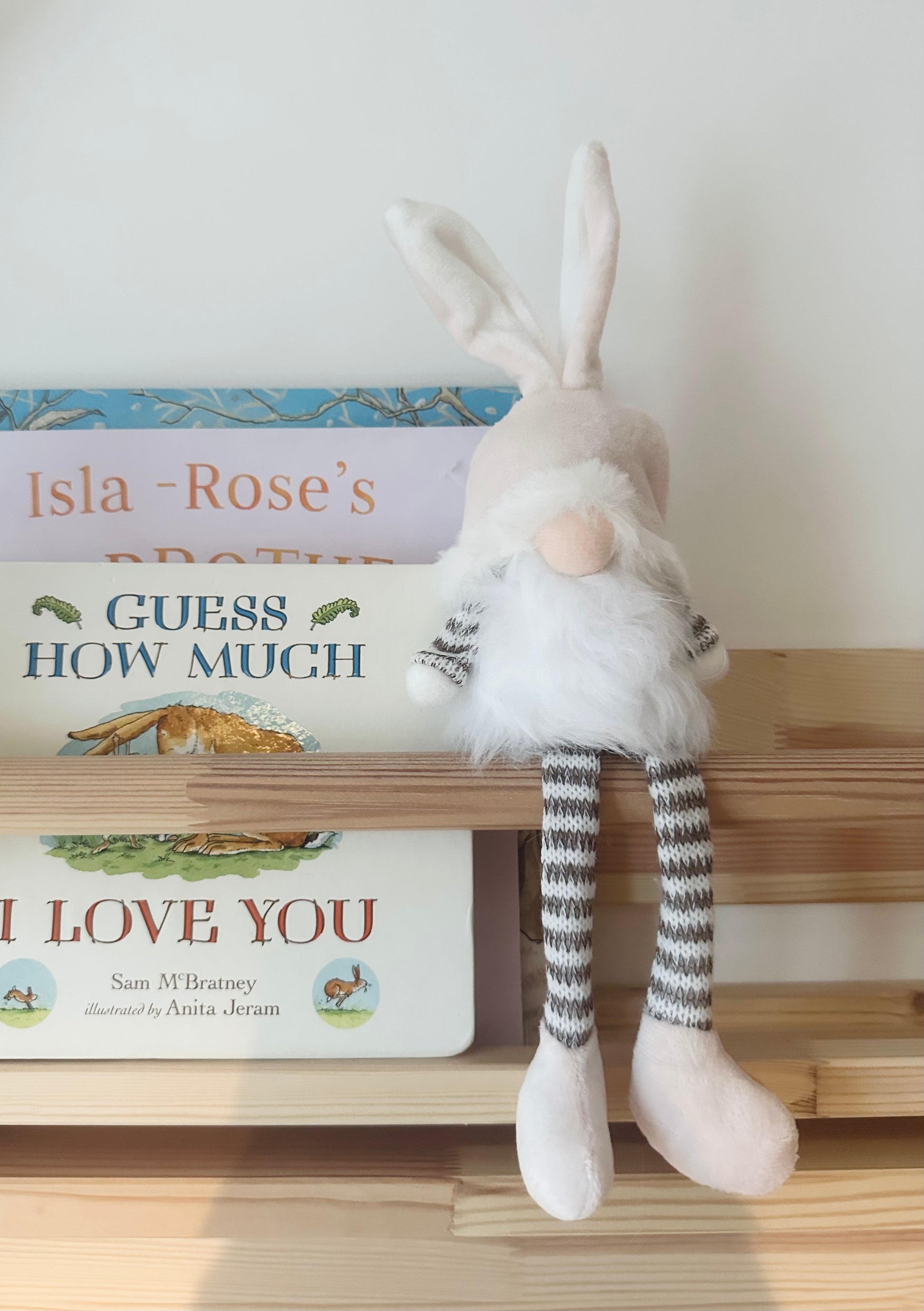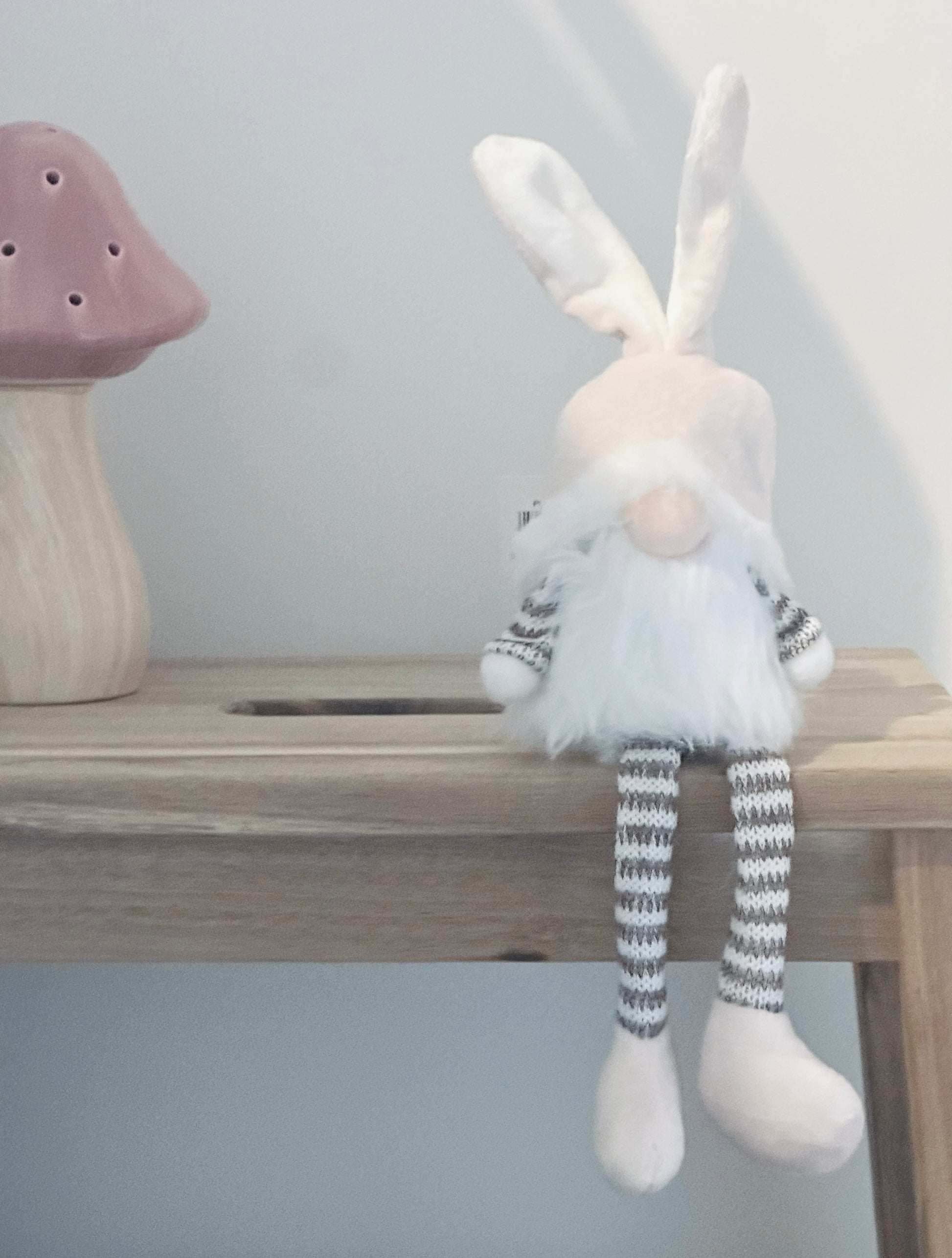 An adorable and unique textile gonk with bunny ears. A soft to touch seasonal decoration, which is perfect for gifting and displaying on shelves and around the home.
