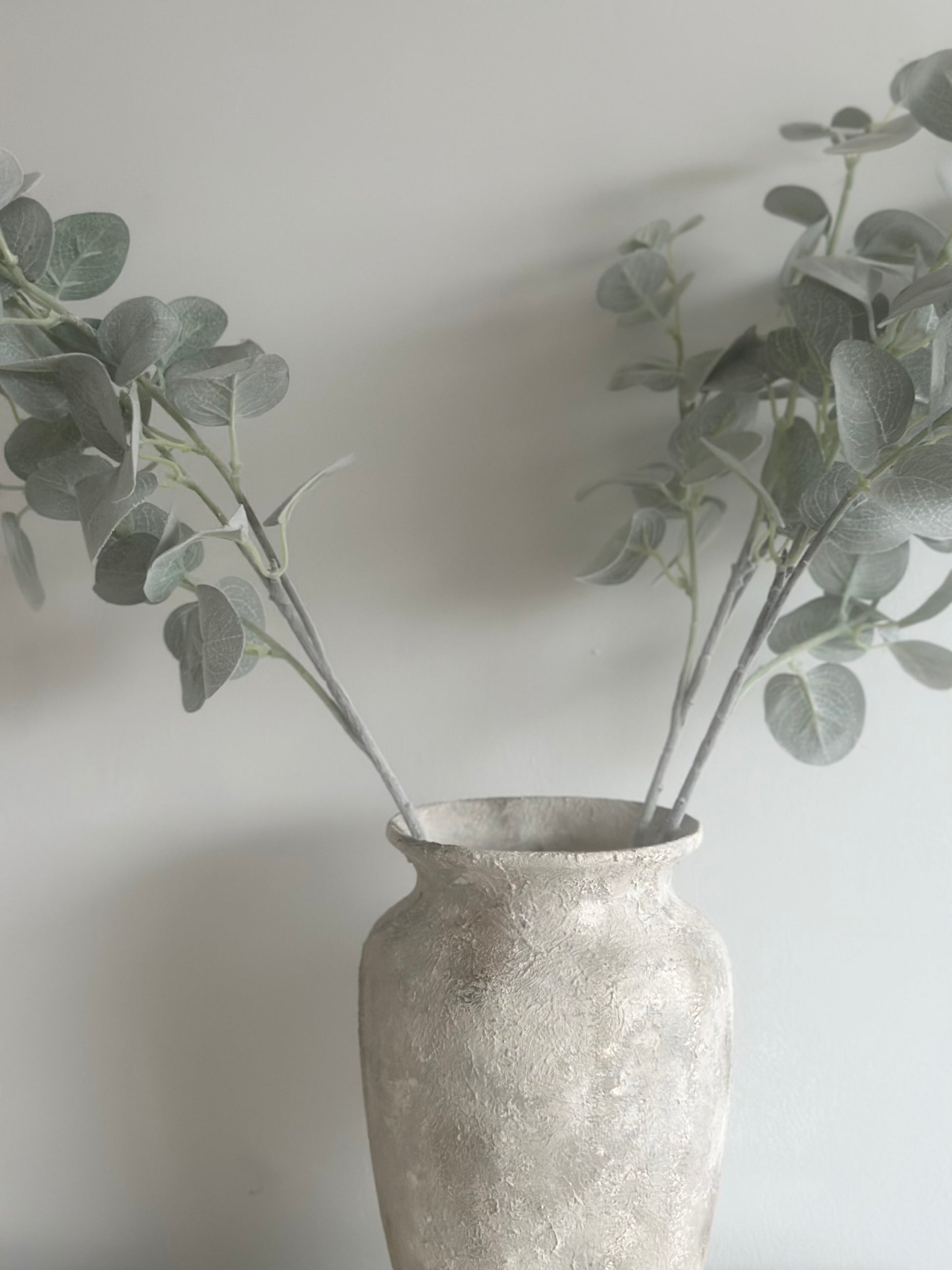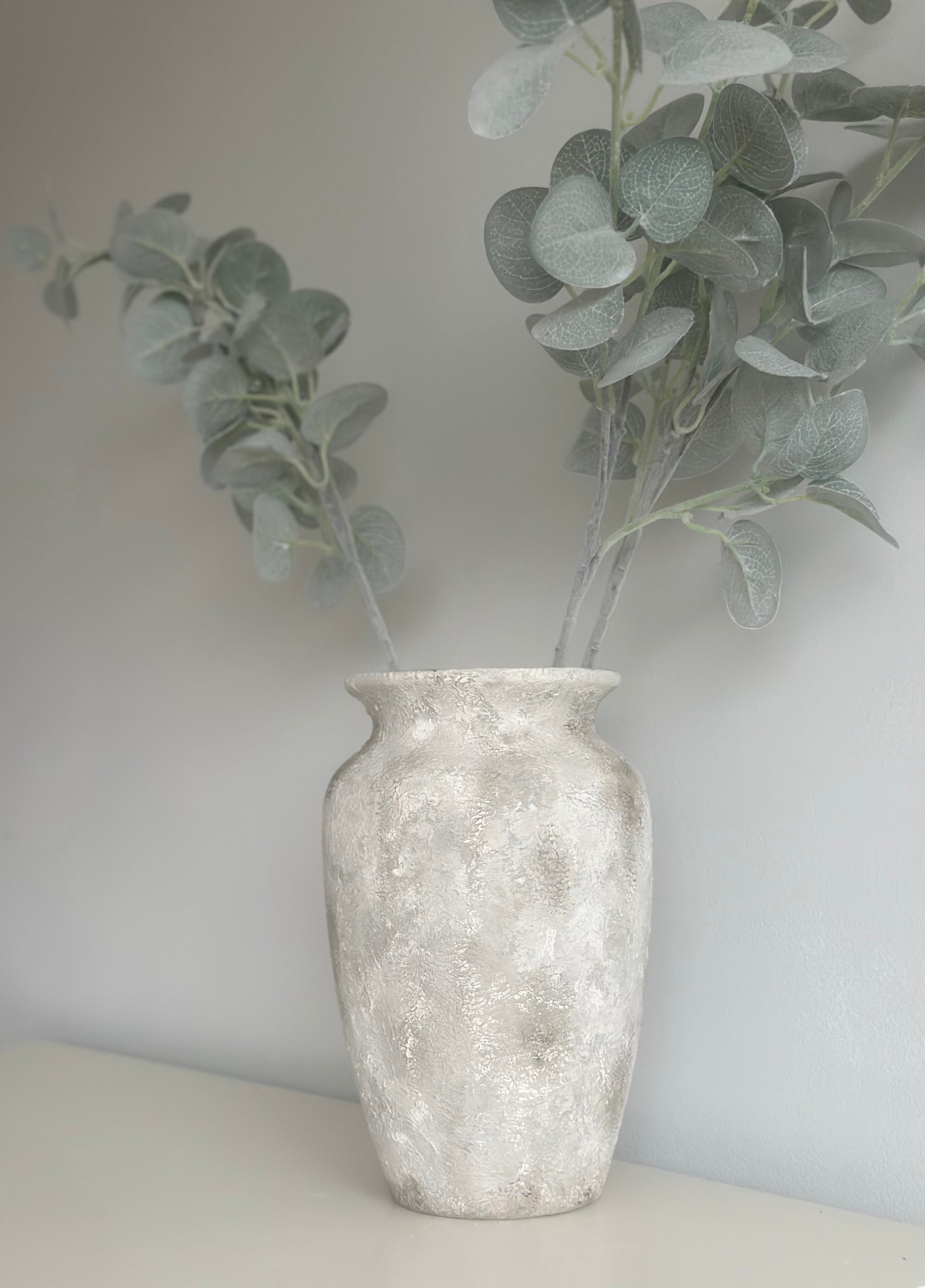 This contemporary hand painted cream and beige vase blends rustic and elegance for a unique touch to any home decor.