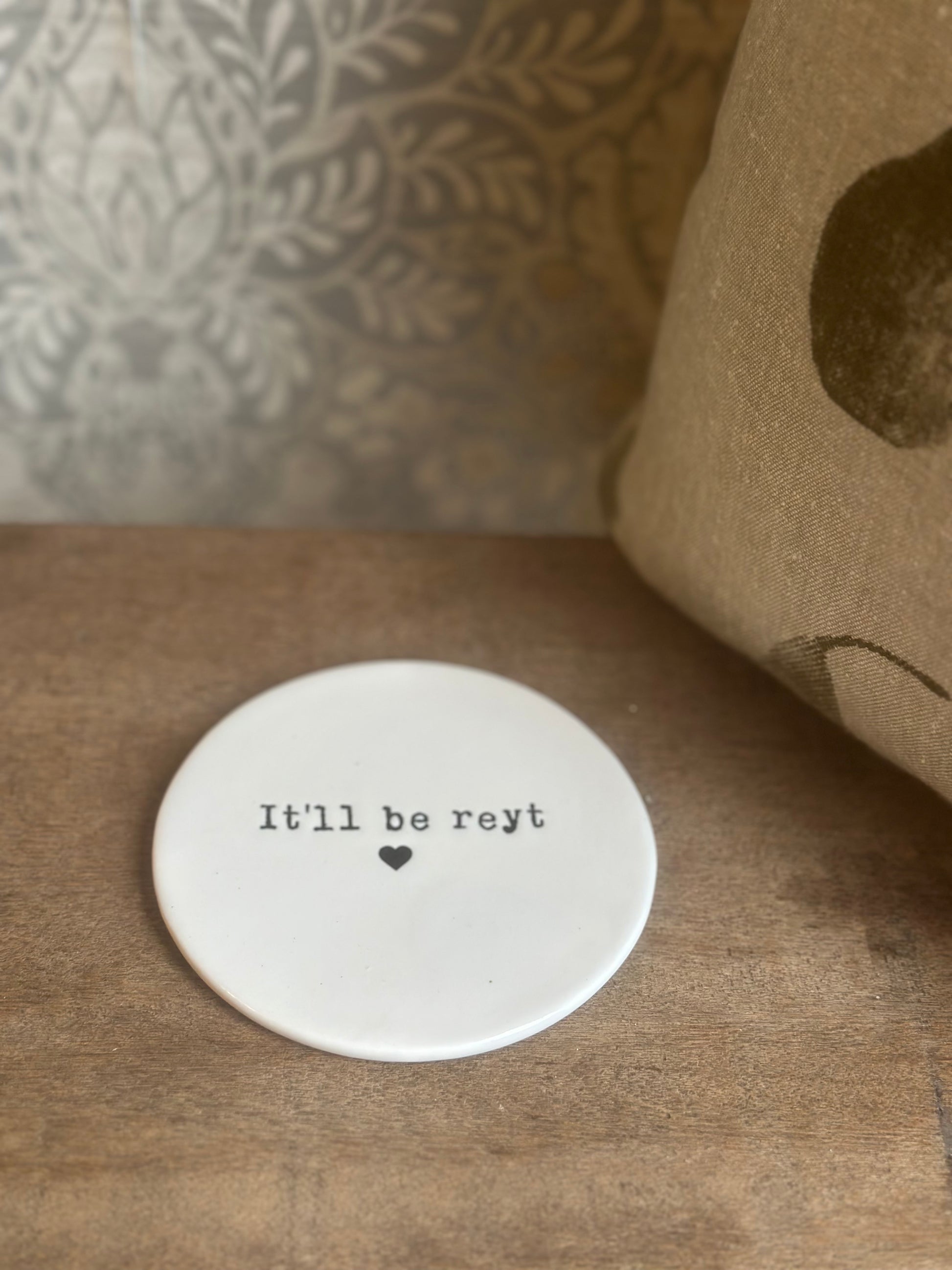 Designed for those who appreciate a touch of humor, the It'll be Reyt Coaster adds a unique twist to your coaster collection with its quirky "It'll be Ryet" transcript.