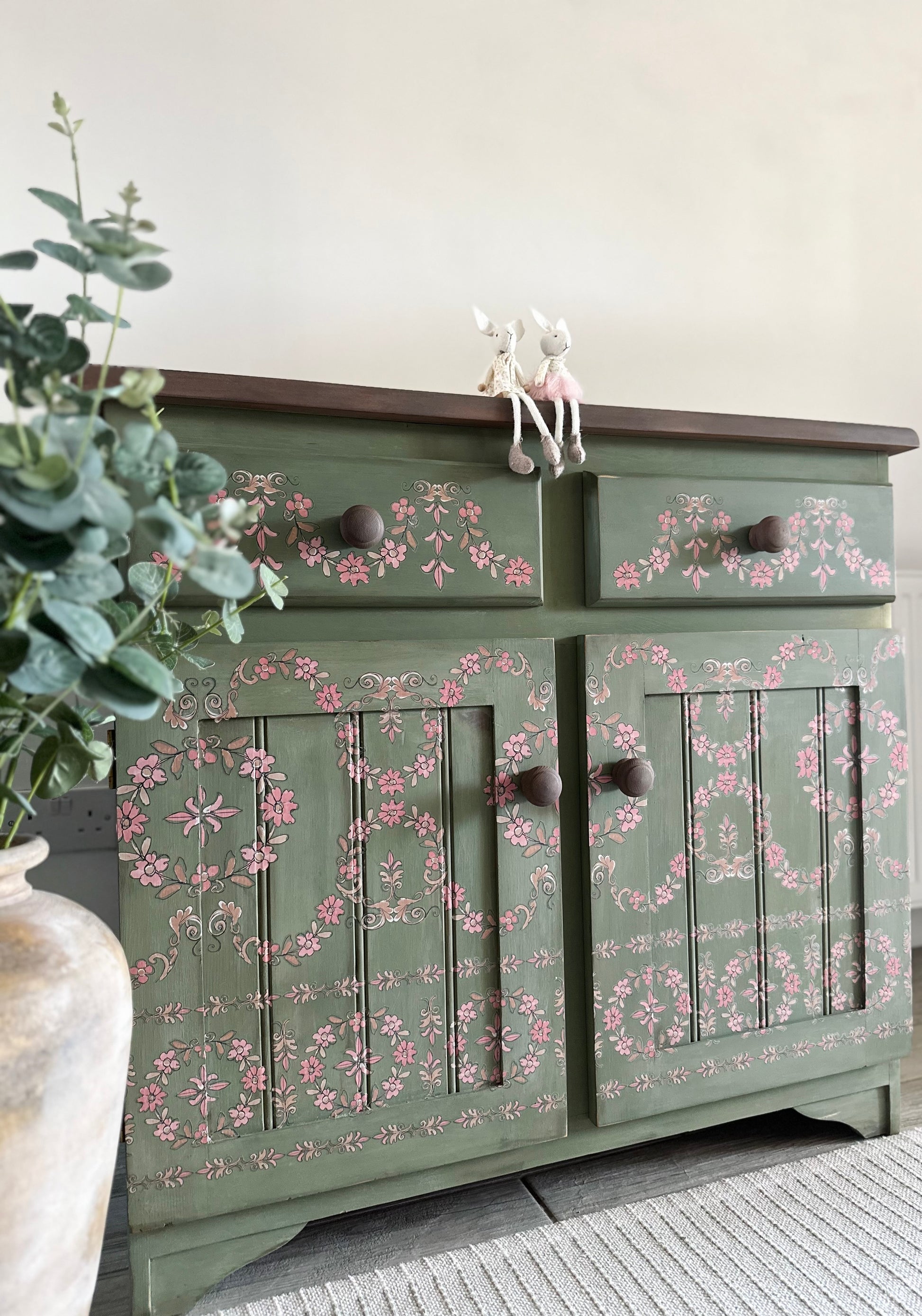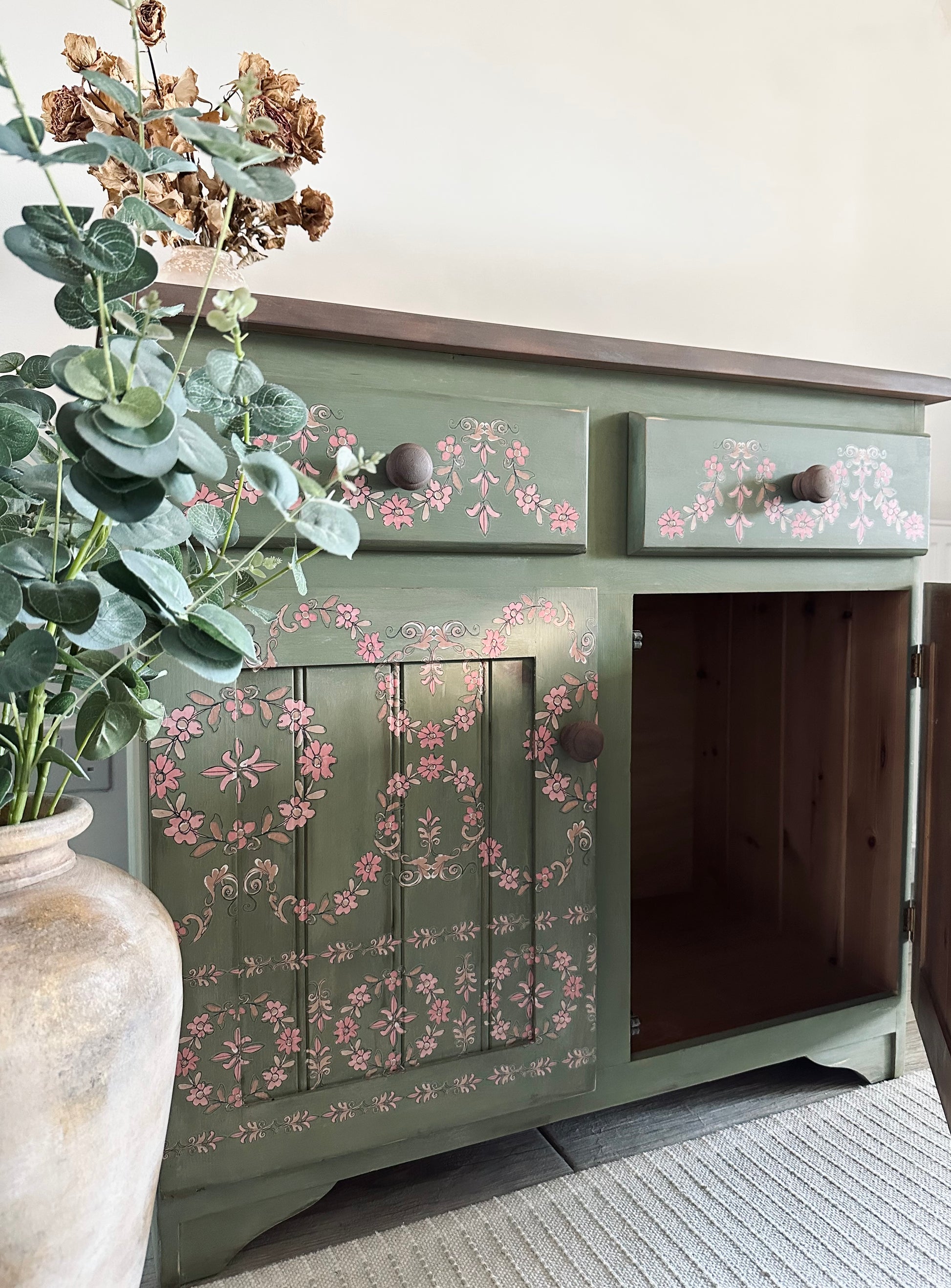 This hand painted pink flower design pine cabinet will add lots of charm to your home.