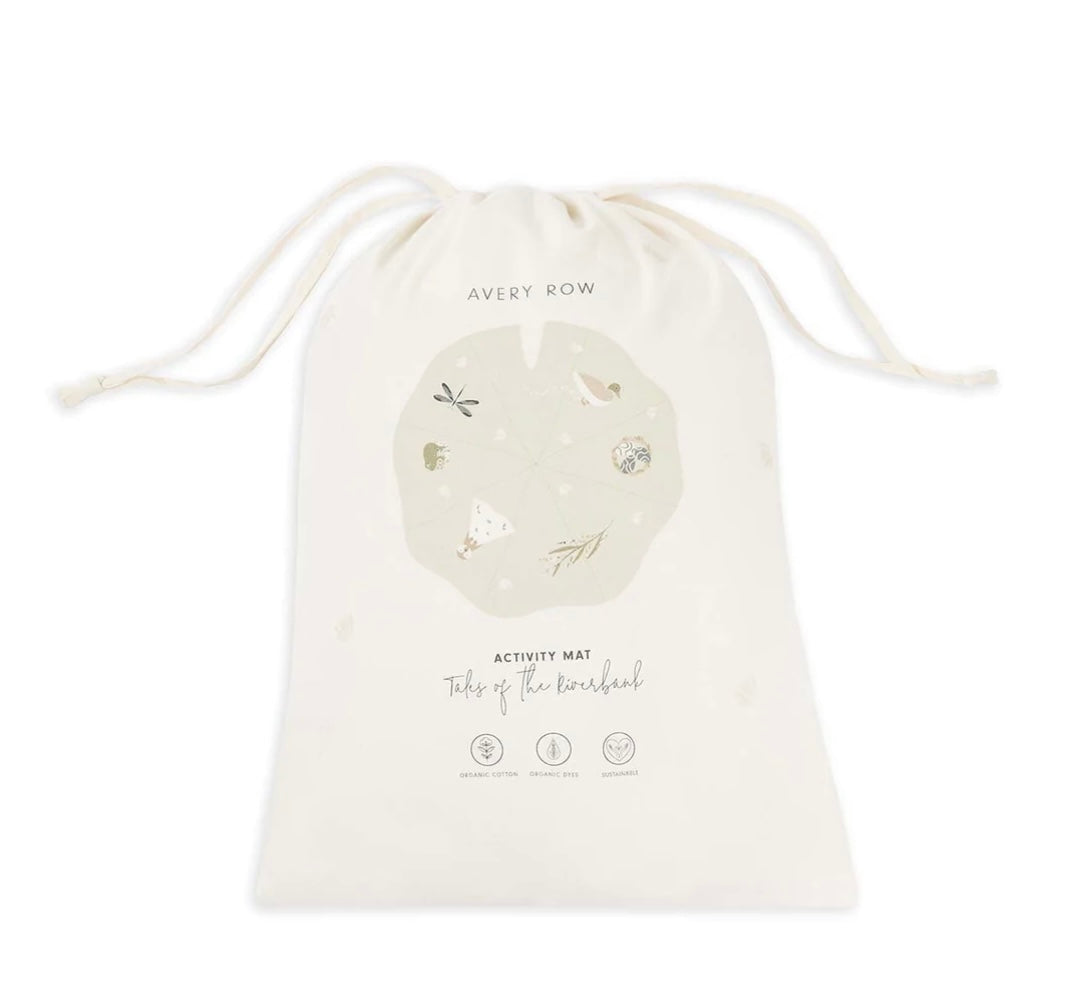 The Avery Row Lilypad shaped activity mat features all your favourite friends from the Avery Row Riverbank Collection. With sensory elements such as a mirror, frog toy, crinkly leaves and a squeaky fluffy duck, this activity mat is designed with playing at home in mind. Made from 100% organic cotton and recycled polyester filling, this mat will entertain your little ones and fit perfectly into your home. Comes with a convenient drawstring canvas bag for easy storage.
