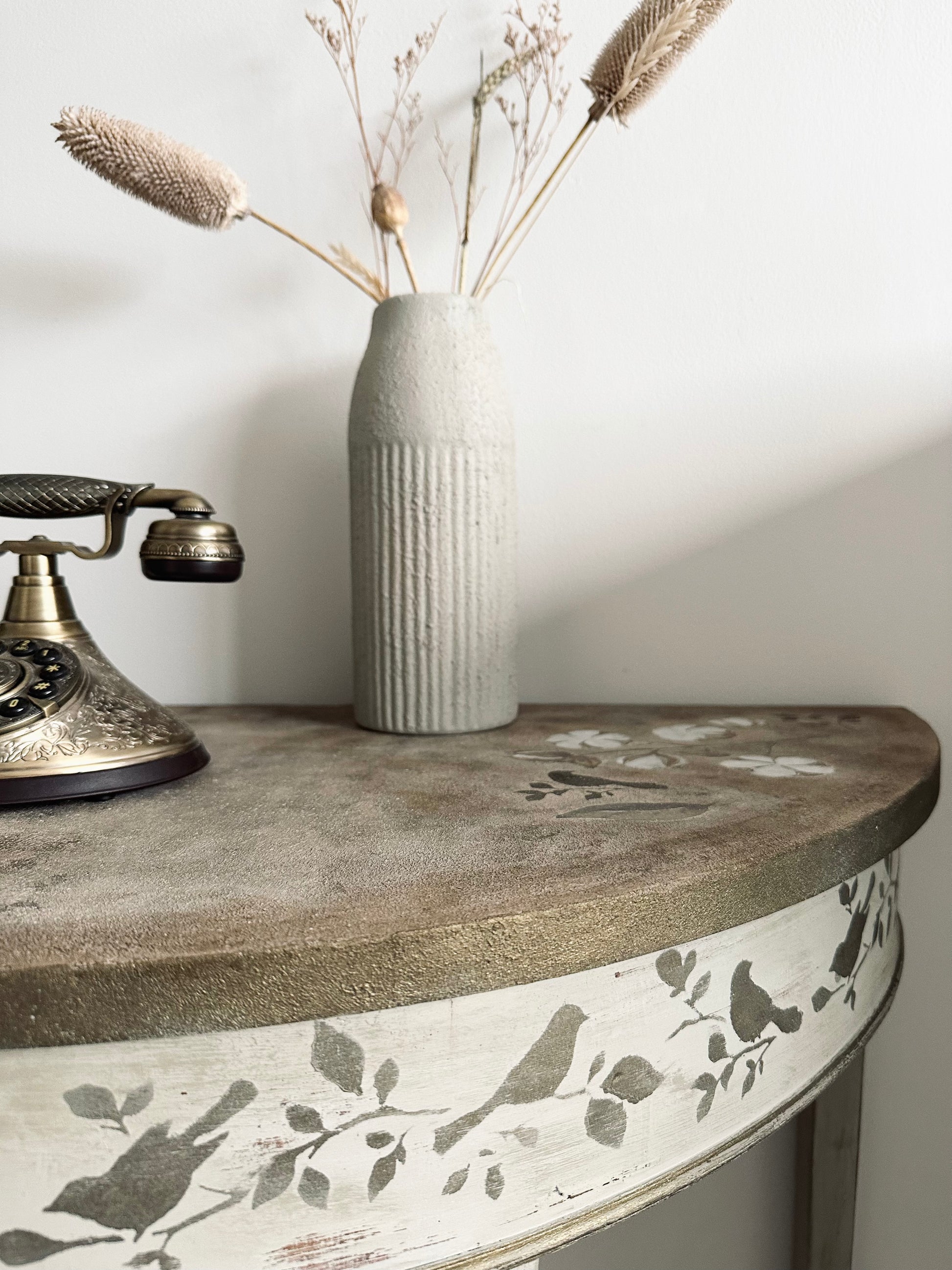 Hand painted in rustic neutral shades. The top in an earthy beige shade with texture added and blended brown and bronze to create further dimension.