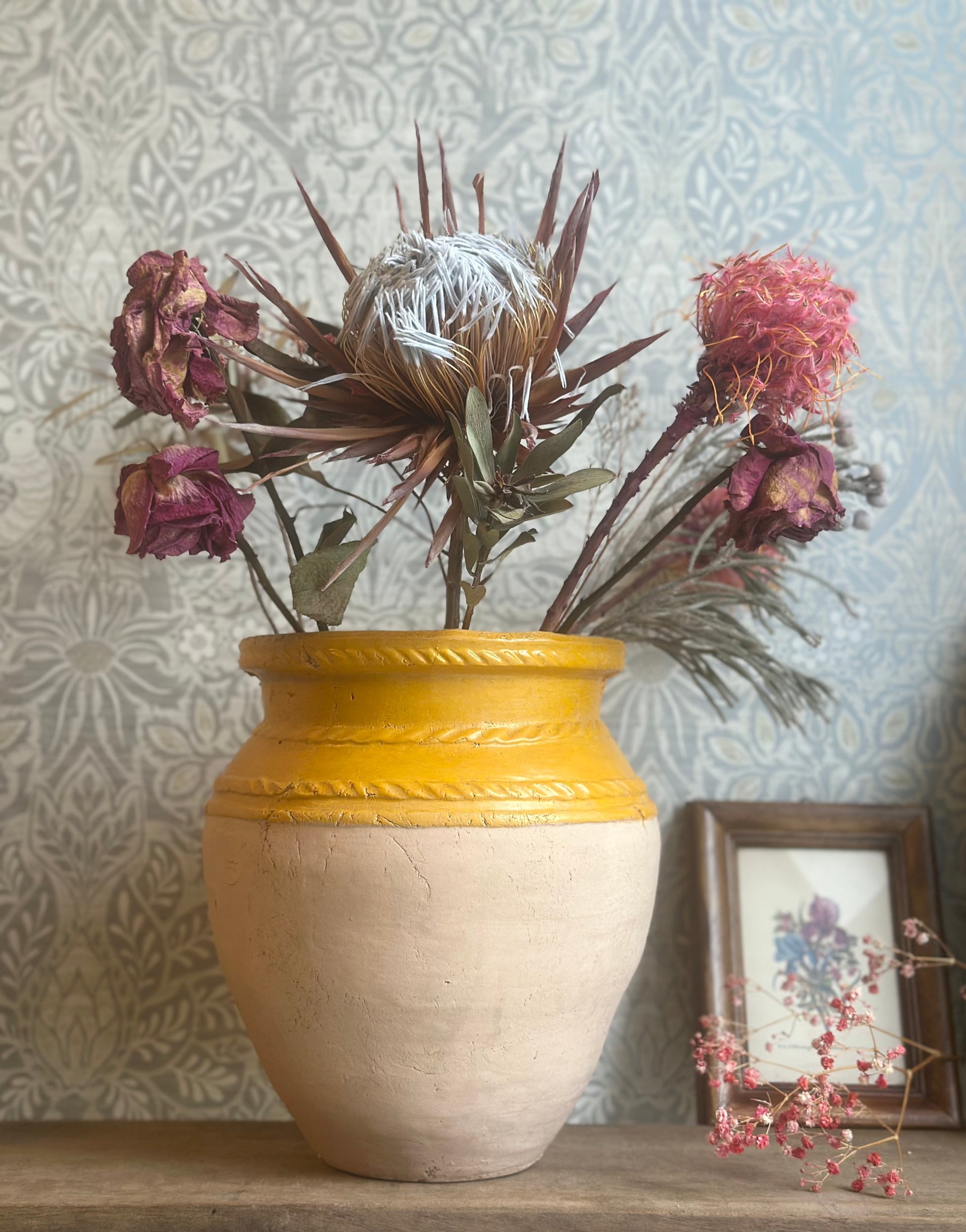 The Rustic Yellow Terracotta Vase is crafted from high-quality terracotta, offering durability and a natural aesthetic. Its distinct yellow hue enhances its rustic charm.